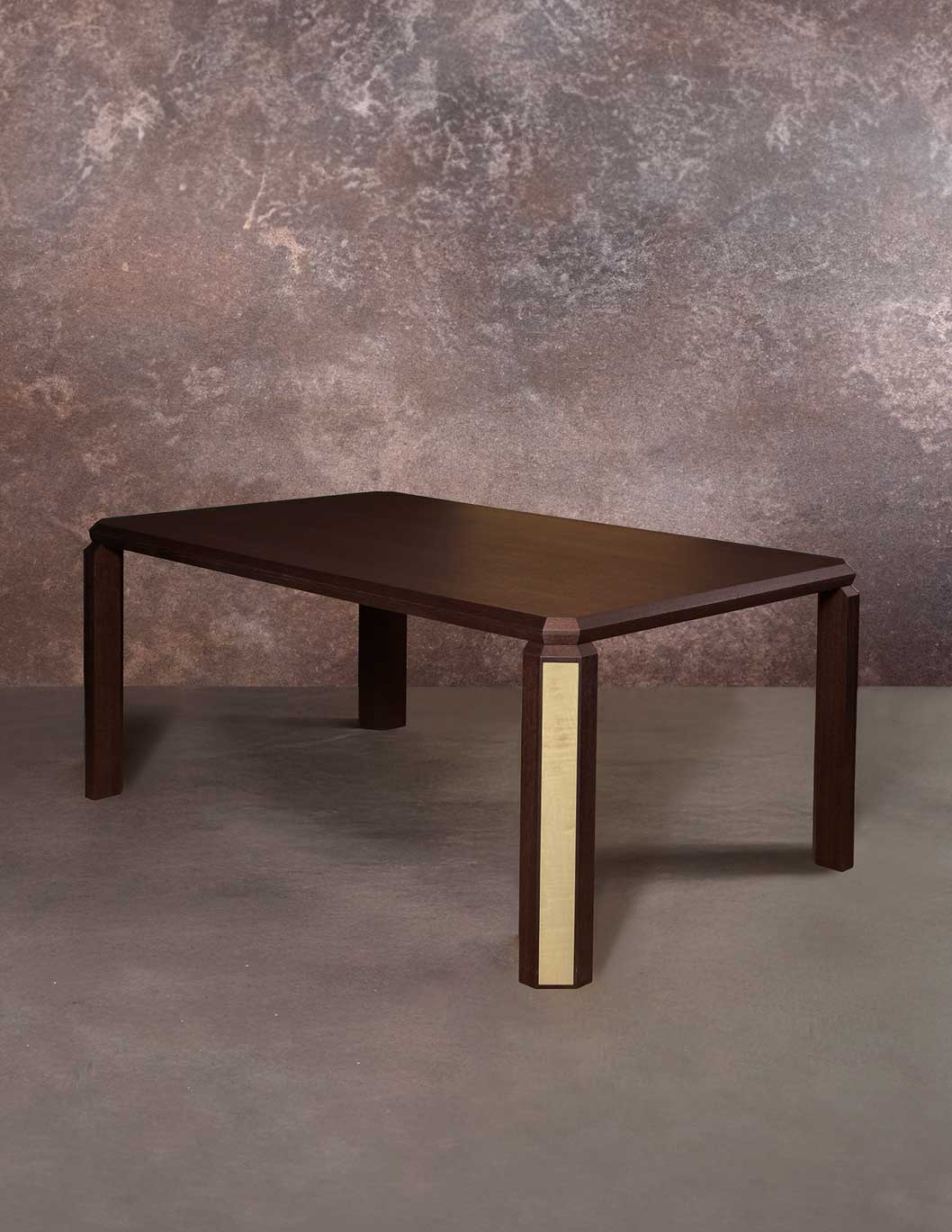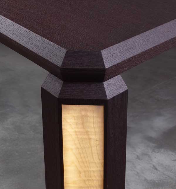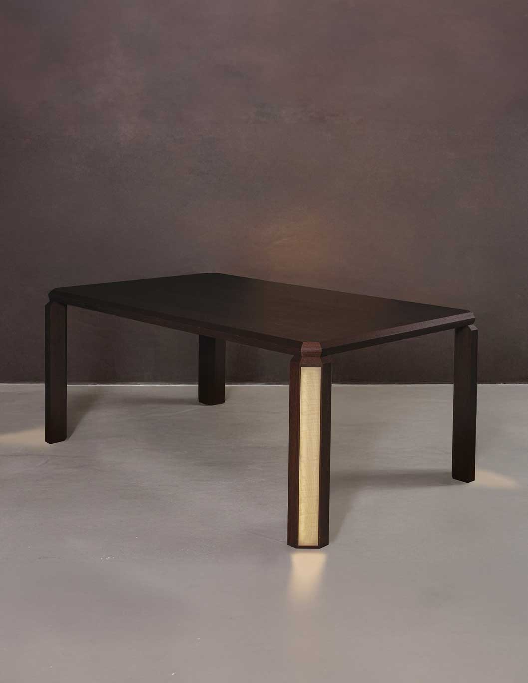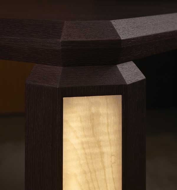 Le quattro gambe scultoree integrano la tecnologia luminosa Brightwood® su una delle facce, creando un effetto visivo sorprendente.